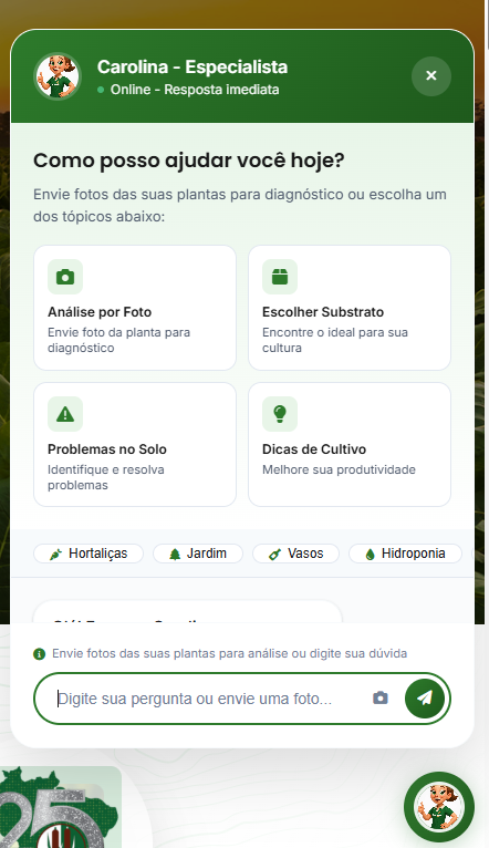 Vê 4 cards visuais bem práticos: "Enviar Foto da Planta", "Escolher Substrato Ideal", "Problemas no Solo" e "Dicas de Cultivo". Pode clicar ou digitar sua dúvida.